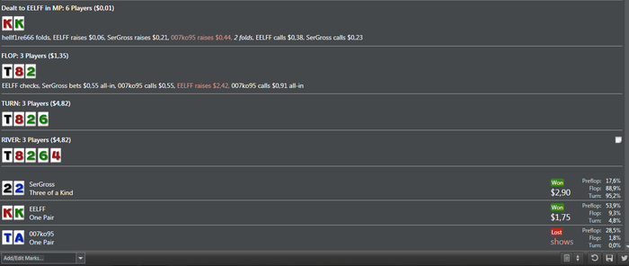 Вот я подумал почему нл5 так тяжело дается,может быть ху..во играю - да не настолько же чтобы его не побить,может быть надо подключить кучу различных программ - да не это же не нл 200,нет мне просто банально не везет. Рег на нл5 агрессивный ставит все улицы подряд,и конечно чтобы добрать с него по максимуму я не 4 бетнул на его рейз как обычно а сыграл колл с АА и КК,оставшись с ним один на один,но увы ему просто тупо доезжает