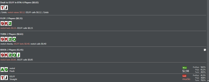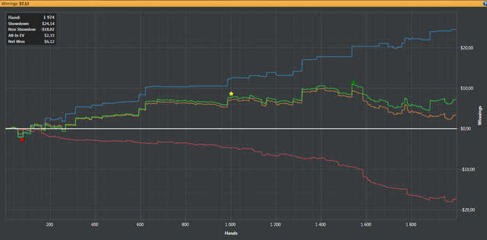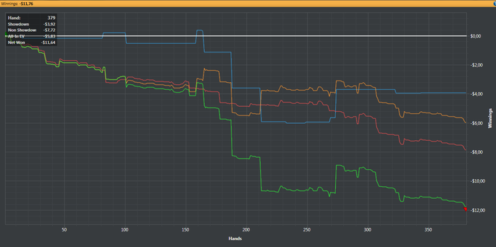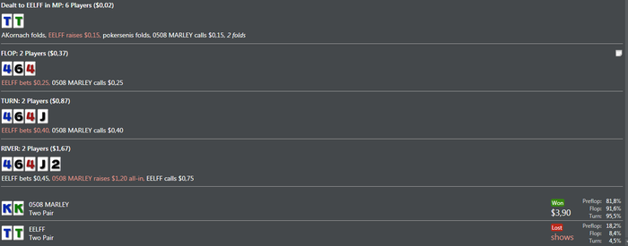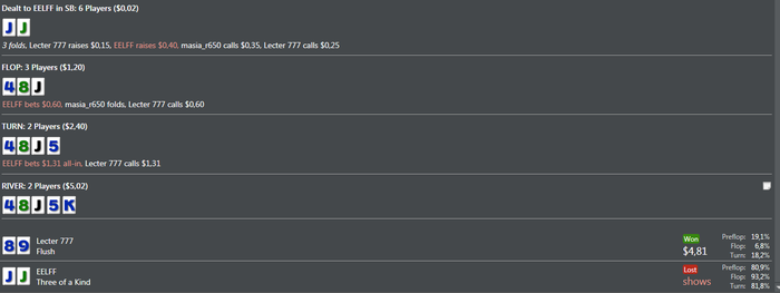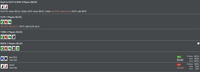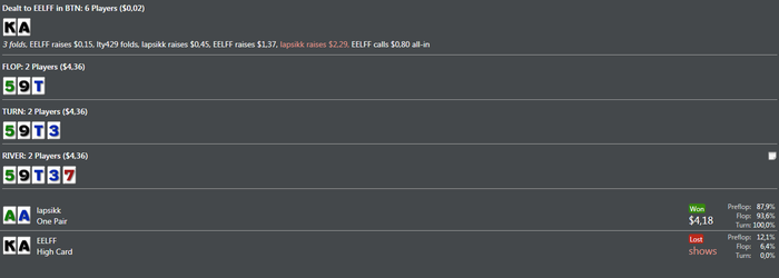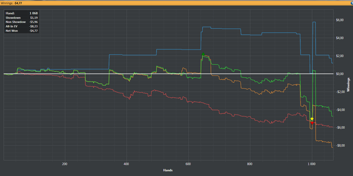 BAHAKC, Дружище если бы это был мало неизвестный мне соперник,я бы естественно 3 или 4 бетнул ,но так как я знаю стиль игры этого рега то хочу добрать с него по максимуму,на 4 бет он бы скинул и я заработал бы всего 0.15 центов,он практически всегда ставит все улицы подряд я решил зайти колом,префлоп эквити у меня 80% ему просто повезло вот и все.Это покер и чтобы что то выигрывать надо применять различные стратегии под разных игроков,играть тупо однообразно это не для меня.