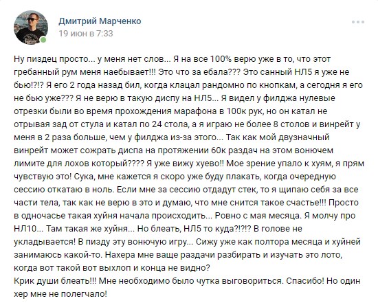 Так так так... последний свой пост я писал 1 мая... тогда я еще не знал, какую задницу мне подготовила жизнь и на сколько будет суровым этот, сука, гребанный май месяц... Буду краток и просто выложу сюда скрин с моим комментарием в одной покерной группе, в которой я очень часто общаюсь со своими друзьями и товарищами.