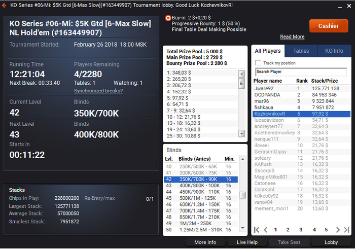 Тяжёлая сессия к ряду, если вчера 17 часов длилась сессия, то сегодня 13. Чувствую себя, как выжатый лимон, а ещё сегодня на работу идти. До 2 марта отдохну. Продолжаю катать на ПатиПокере серию КО турниров и сегодня снова удалось выйти на финалку в эвенте 2.20$ (6-мах), но занял 5 место из 2280 человек😩 Так же сегодня отобрался на сателлит 1к$ в Барселону, 4 марта старт турнира, надо тащить!