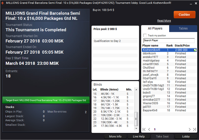 Забавное решение Пати о несостоявшимся финального сателлита в Барсу, но в принципе предсказуемо было. Они просто перенесли этот сателлит на 11 марта, с такими же стэками, которые были у всех. Всё бы ничего и даже выгоднее стал сатт, так как увеличили гарантию до 20 пакетов, но я физически не смогу сыграть, так как буду на работе. Написал в саппорт, буду ждать ответа.