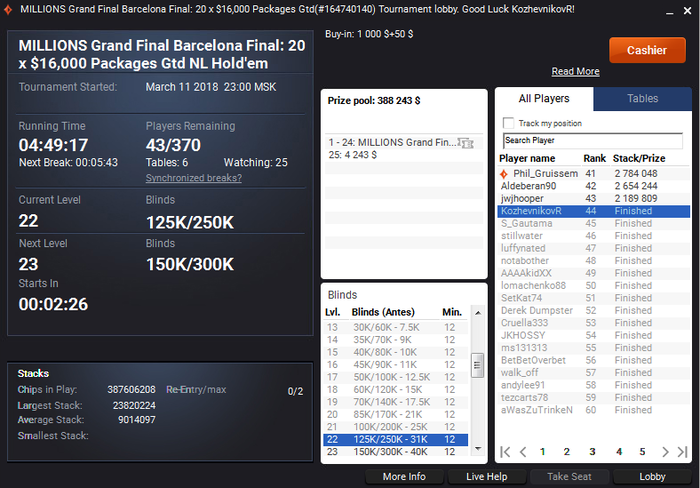 Party, $954.55 Buy-in (125,000/250,000 blinds, 31,000 ante) No Limit Hold'em Tournament, 7 Players Poker Tools Powered By Holdem Manager - The Ultimate Poker Software Suite.