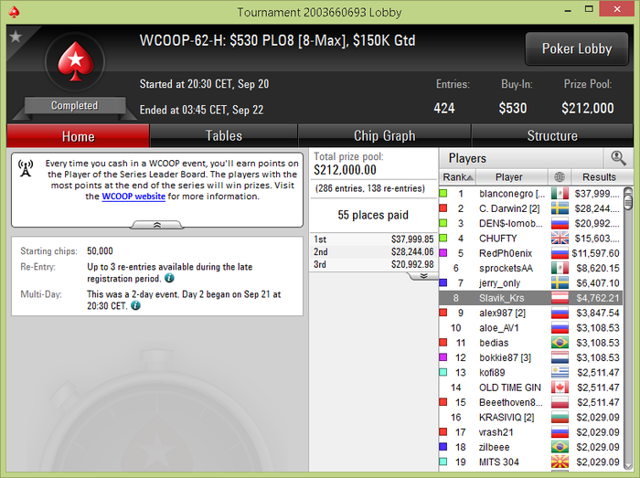 Slavik_Krs (MP+1): 172,486 (34 bb)vovtroy (CO): 405,779 (81 bb)