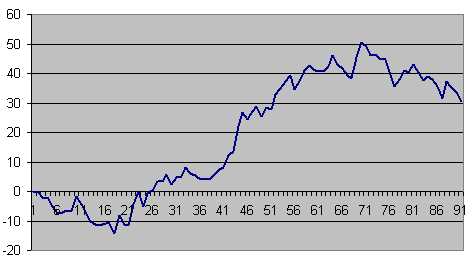 Я играю по алгоритму. Который сначала (и все время) тестируется на прилегающих к сегодняшнему дню архивах линии. Там, к сожалению (ужасу, испугу) на графике профита время от времени попадаются участки, когда профит 400-500 ставок подряд в целом все сползает да сползает...