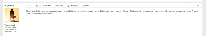 кто не играет спины, не лезьте со своими расчетами по столам-часам, вы же профаны в этой области. здесь есть ограничение по качеству игры - то есть ТС будет не просто играть, а играть в плюс. в спинах решение нужно принимать каждые 5-10 секунд, у большинства спинеров перерывы меджу блоками катки каждые час-полтора (тупо голова перестает соображать). то что делает ТС беспрецедентное шоу, это будет очень сложно сделать, каждый из вас сможет сделать то же самое - только каждую руку придется пушить и тогда можно и 25000 отыграть, а вот отыграть в плюс по ЕВ это совсем не то же самое. так что расчеты - количество столов* время на один спин не совсем корректны.