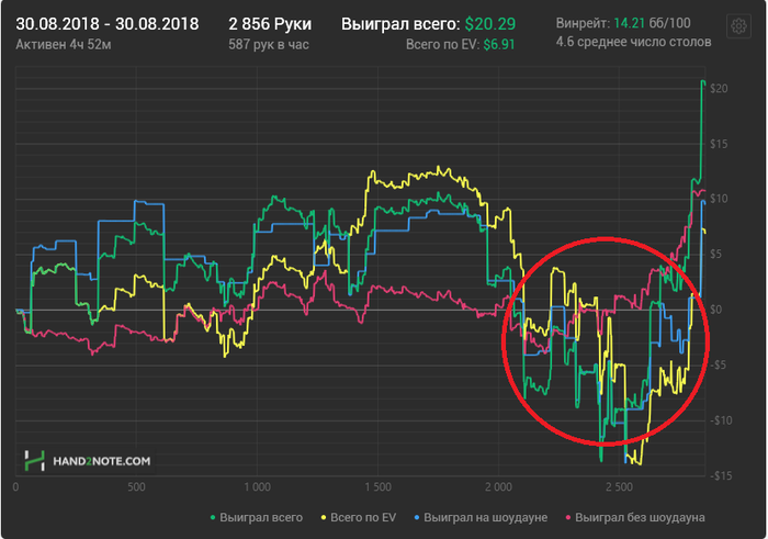Пока теряюсь в выборе стиля игры, по началу сессии я придерживался довольно тайтового стиля игры с минимумом ошибок, все шло медленно, но сбалансировано, я был уверен в каждом своем решении и старался не попадать в сложные ситуации, но потом, совершив 1-2 ошибки, которые стоили мне дневного профита, я включил агрессора (можно увидеть по графику, как он превращается в кардиограмму). В конце, конечно, мне все вернуло, даже сполна, не без участия апа, но все равно осадок остался.