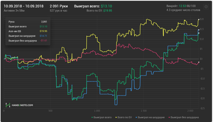 Сегодня отыграл небольшую сессию 1777 рук с профитом +$11,65, считаю это дно. Очень маленькая дистанция, т.к. в начале дня ленился, а под вечер свалилась куча дел, которые мало от меня зависели.