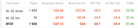 Переключившись на более агрессивный стиль, значительно просел по ЕВ, однако красная пошла в плюс, я хз как лучше играть, в принципе, красная не так уж и важна на этих лимитах, но я думаю, если бы не стиль агра, то еще долго пришлось бы месить рейк за столами, чтобы хоть как-то выйти в плюс. Найти бы золотую середину.