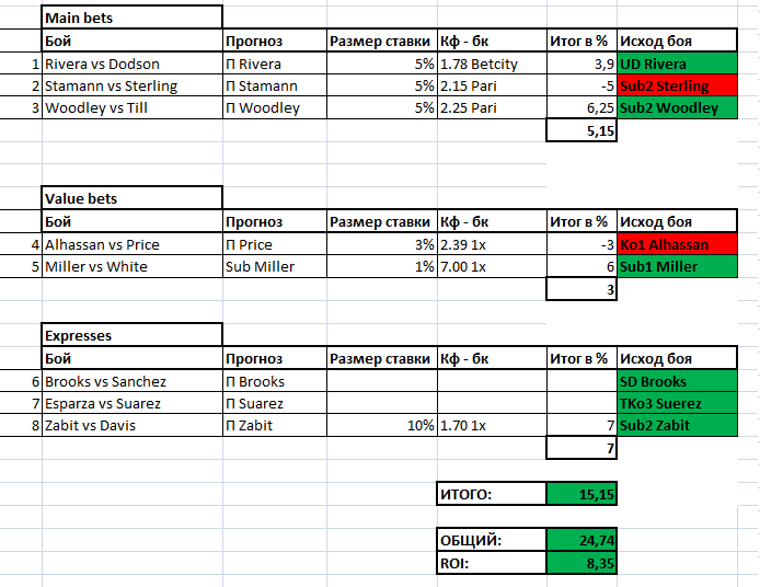 Победа Двалишвили. Классическое противостояние борца и ударника. В 80% случаев борцы одерживают победы. Более того, Двалишвили не просто борец, он grinder, который не дает тебе даже секунды отдыха. В прошлом бою Мераб проиграл уже после окончания боя, потому что к моменту гонга уснул от гильотины Рики Саймона. Весь бой Двалишвили возил и бил Саймона, но ошибся на последних секундах боя. А Рики Саймон куда сильнее Терриона Вэйра – соперника Двалишвили. В итоге, Мераб должен стереть своего соперника в порошок. Победа Тайсумова. Я считаю Тайсумова реальным убийцей. Не устаю повторять, если бы не его проблемы с визой, он бы был уже в топ-5 легкого дивизиона UFC минимум. Страшная нокаутирующая мощь и отличные навыки борьбы делают его превосходным бойцом ММА. Десмонд Грин - базовый борец, выносливый боец, но будет ли он стараться во чтобы то ни стало перебороть Тайсумова? Скорей всего да. Таким образом, Майрбека ждет неплохая проверочка защиты от тейкдаунов. Если с ней все в порядке, очередного Ko не миновать. Тайминг и нокаутирующая мощь... ни кого не напоминает? Если Грин остановится хоть на пару секунд в своих перемещениях, или неверно расчитает атаку, он рискует быть нокаутированным быстро и безапелляционно. Учитывая инцидент с ДТП с участием Грина, совершенно не понятно, в каком психологическом настрое выйдет боец. Майрбек же точно выйдет мотивированным и заряженным на уничтожение. Вероятно, сейчас это единственный боец из легкого дивизиона, на которого бы я поставил против Хабиба, потому что у него есть реальные ключи к победе над Орлом. И, кстати, ставка на досрочную победу Майрбека также актуальна. Победа Яна. Петру Яну подсунули на коротком уведомления корейца Сона. О нем мало информации – ударник, тренируется с Корейским Зомби, выступал в Японском промоушене Deep. UFC безусловно молодцы, что нашли хоть кого-то, потому что никто не хотел драться против Петра Яна. Корейцу можно только поаплодировать за его бесстрашие, вышел на коротком уведомлении. Уверен, что мы увидим досрочную победу Яна. Главное, чтобы он оставался сфокусированным и обошелся без недооценки соперника. Его стиль и сильные стороны я уже описывал ранее перед боем с Теруто Ишихарой. Думаю, пока что ничего не изменилось.