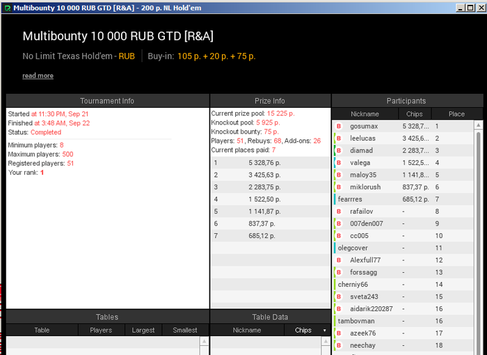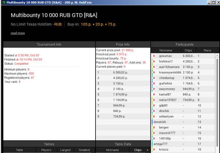 на счет взять себя в руки это ты прав ) стараюсь и я играю турниры от 200 до 3к Да и цели по времени нет если не увидел вдруг)