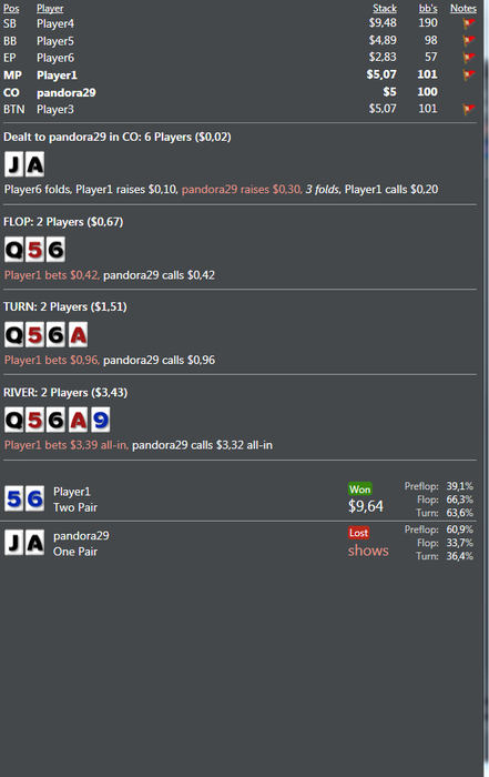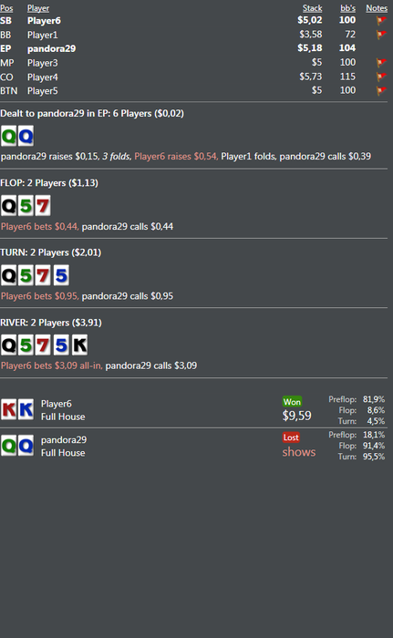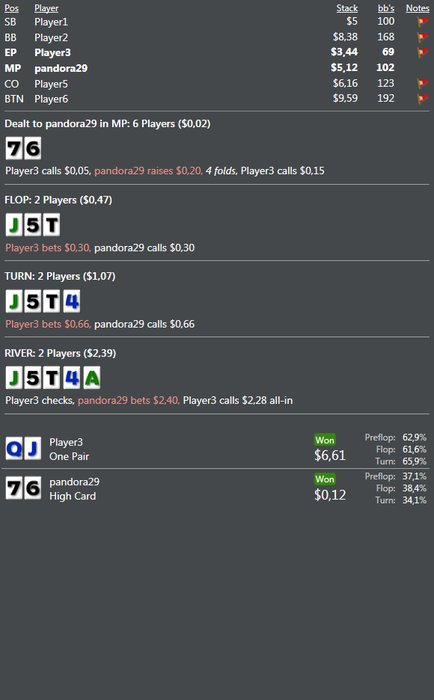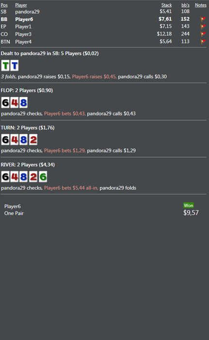 Нужно больше ставить, хотя бы флоп... вообще линия по себе странная, по которой ты просто говоришь, что у тебя слабая рука и я скину на любую ставку.. если уж совсем не нравится борд на терне, и не знаешь что делать, сыграй просто чек/фолд... а твоя ставка на терне вообще ни о чем...