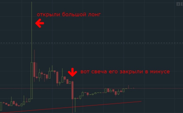 вот напрмиер ночью сегодня, закрыли 500 биткоинов из лонга по финику, если они их закрывали по рынку, то это покажет продажу большую, что то кто то продал 500 битков.