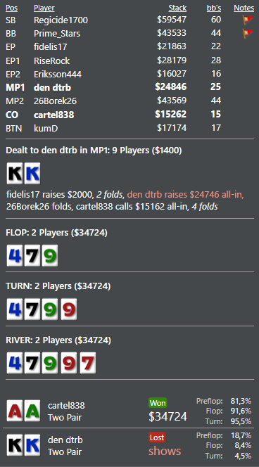 VitalyKhd, да, у меня тоже давненько такой интересной финалки не было. Спасибо за игру! Всегда приятно поиграть с достойными соперниками (хоть это и минус ЕВ ) Разобрать можно, я только "за". Пиши в личку! - обсудим. Если есть желание, то можно на постоянной основе делать совместный разбор раздач и работать над игрой, а также вместе идти вверх по лимитам. Синергия - это сила! У тебя отличный РОИ в МТСНГ! Подписался на твой блог! P.S. Без обид если что гуд гейм с твоей стороны, но ты действительно выдавал инфу в чате, я это запомнил хорошо.