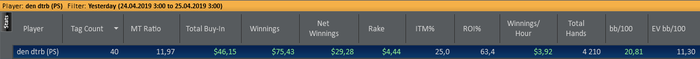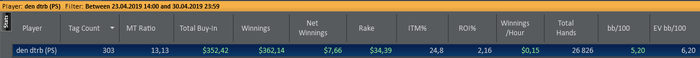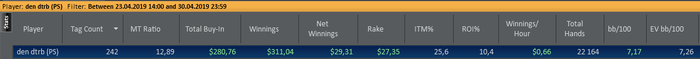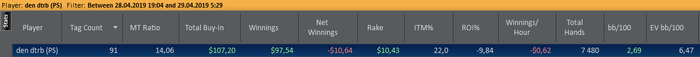 Поставил сразу 2 новых рекорда: 1. Количество турниров за сессию - "91"(предыдущий рекорд - "60 турниров" ; 20.01.19) 2. Количество рук за сессию - "7480"(предыдущий рекорд - "7229 рук" ; 20.01.19)