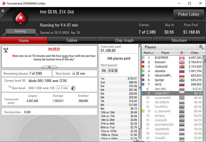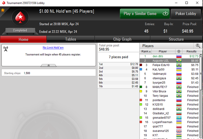 1. Начало: 23 апреля 2019 ; 14:00 МСК 2. Конец: 30 апреля 2019 ; 23:59 МСК 3. Дистанция: минимум, 300 турниров 4. Засчитываются любые турниры: МТТ, МТСНГ, сателлиты 5. Засчитываются турниры, которые начались до 23:59 МСК ; 30 апреля 6. В случае невыполнения, с помощью рандомайзера, выбираю одного случайного пользователя из всех плюсанувших этот пост и перевожу ему на счёт - "10$"
