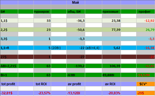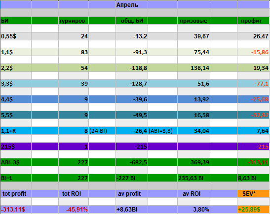 Месяц хочу полностью посвятить обучению. Пока также катаю МТТ 1,10$...2,20$ и МТСНГ регспид за 1-1,5$. Целей по дистанции на май ставить не буду, повторю лишь свои главные задачи ближайшее будущее.