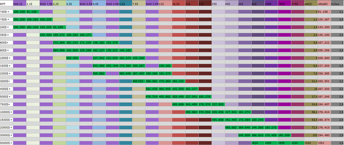 Зеленым цветом выделены играемые турниры при соответствующем БР, а цифры внутри означают сколько бай-инов составляет банкролл aBI($) - средний бай-ин xBI(ABI) - количество средних бай-инов hi/low - разница между самым дешевым и самым дорогим турнирами