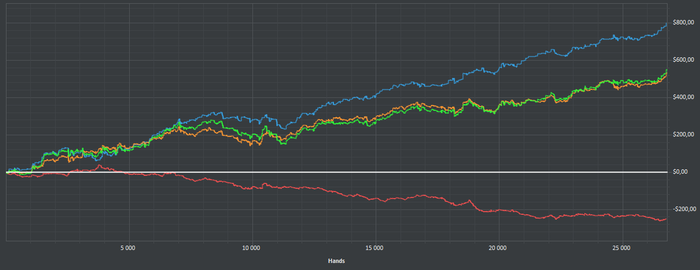 В общем, посмотрел раздачи с проигранными банками насчитал ошибок на 36,96 $ за 787 раздач (и это я еще не смотрел банки, которые я выиграл) из них две дорогие 14,46$ - глупый блеф, по факту, самое страшное что если бы чел почему-то скинул на ривере, то я бы решил что это крутая линия и продолжил бы применять, не разбирая раздачу (по крайней мере пару месяцев назад я бы так сделал, сейчас я верю что все равно бы разобрал). 9,05$ там был инста мегасупердонкпуш от фиша на ривере где я вколол эти самые 90бб и при этом не бил ни одной руки. Смотрел один вод, там хиро рег нл100-200 практически ту же самую ошибку сделал и тренер ее разбирал. Очень надеюсь что я к нл100-200 так делать уже не буду.