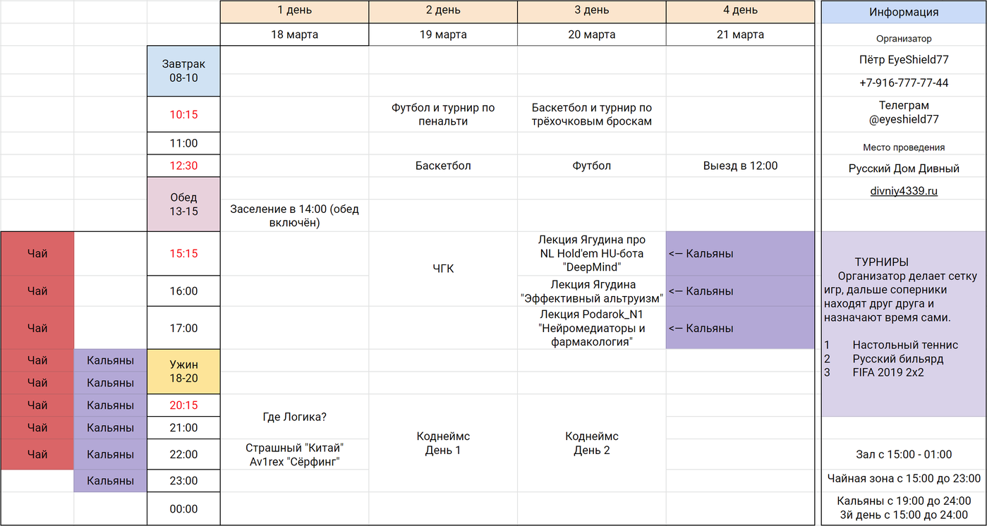 Новая версия расписания, которая ничем не отличается от старой: просто в правой части добавлены мои контакты и название отеля. Так что можно пересылать эту картинку знакомым сочинцам/краснодарцам, чтобы присоединялись к нам по ходу встречи. Вот прямая ссылка на картинку: https://forum.gipsyteam.ru/index.php?act=attach&type=post&id=681239