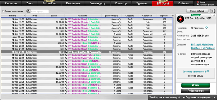 Друзья, всем привет! 27.02 в среду 06.03 в среду 13.03 в среду 19.03 во вторник В покерном клубе "Сочи" состоятся сателлиты на Day 1A EPT Sochi Main Event (buy-in 2740 y.e.) который будет проходить в рамках турнирной серии EPT Sochi (20-29 марта) Начало всех сателлитов в 16:00 ГАРАНТИЯ 1 билет Формат Re-Entry Бай-ин 110 y.e. Cтек 12000 фишек Уровни по 15 мин. Позд. рег-ция первые 8 уровней Мин. кол-во игроков на начало сателлита -12
