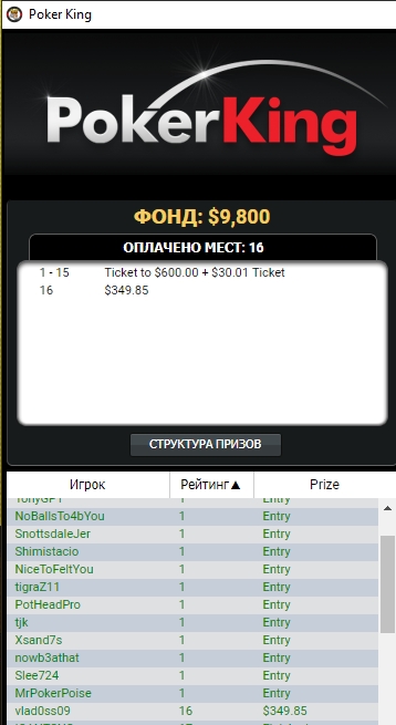 PokerKing: 1 билет по 6.60$ 1 билет за 55$ и 1 за 215$