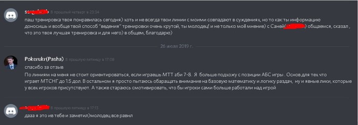 После того как игроки проходят начальные лимиты, с ними занимаются другие тренера. Активно в покер я перестал играть лет 5 назад, и давно не считаю себя проигроком. Но тем не менее у меня очень большой опыт тренировок с новичками. Уверен, что могу им помочь выстроить свою покерную карьеру и сформировать правильное отношение к игре в покер. Поэтому я продолжаю тренировать. После каждой тренировки, игроки имеют возможность оценить мою работу и выставить свои оценки мне как тренеру.