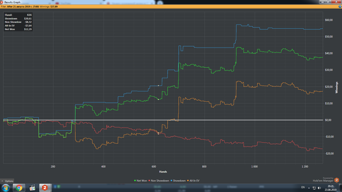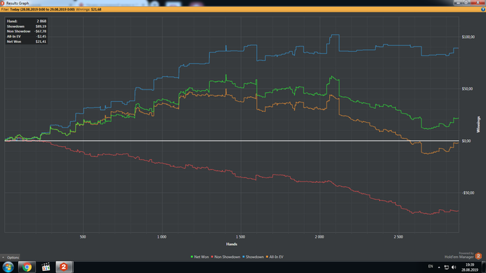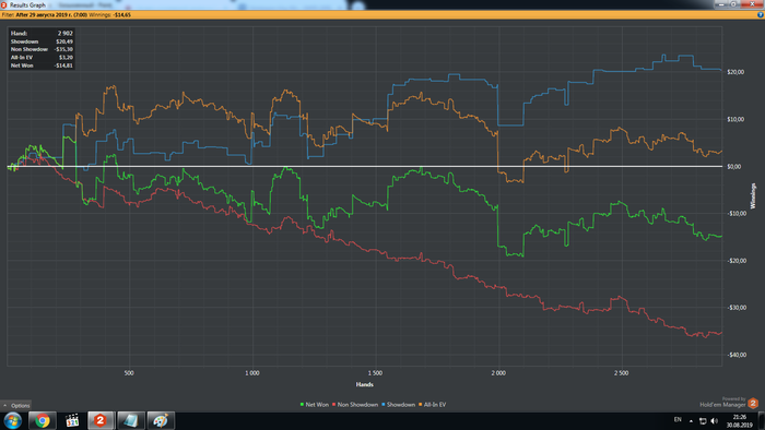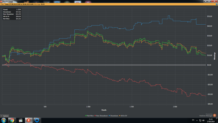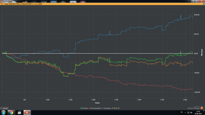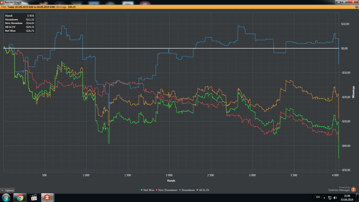 Чувствую себя очень отстойно(( Третий день в крупный минус относительно БР , остались последние 3000 рублей и 21 доллар на счете. Завтра сделаю депозит , будет около 70$. Если опять залью - продолжать в таком настроении не вижу смысла, нужна будет пауза для обдумывания дальнейших действий и нужен ли вообще мне покер. Самое тяжелое для меня - просить денег у близких на такую деятельность, зная их отношение к покеру под призмой азартных игр. Хотя есть осознание, что играю в плюс, но огромное давление никуда деть не могу. Делать что либо по целям тоже нету желания, пока такие пляски на графиках. Нужно несколько дней апстрика, что бы придти в себя и была энергия на другие дела. Основная проблема проигрышей по факту - линия шоудауна за 9к рук в ноль , тоесть крупные и средние банки проигрываются на вскрытии чаще обычного, хотя телефонии осознанной нету. Вылетал два раза сверху практически на бабле бига за 5.5$, что тоже оставило осадок. Наблюдаю огромный диссонанс в мыслях , что по моему мнению является предвестником черной полосы, но это исправляется примерно в течении недели работой с целями, хотя ситуация сама диктует их мне. Винить кроме себя не кого, когда была возможность сформировать банкролл для комфортной игры ( в начале зимы за месяц выиграл более 400к рублей на 888 ) - деньги были просто спущены в черную дыру низких потребностей и в марте уже был на нуле , и так было всегда. Очень хочется быстрей пройти данный этап и вернуть былую веру в себя, а когда веришь в себя, начинаешь жить по настоящему счастливой жизнью)