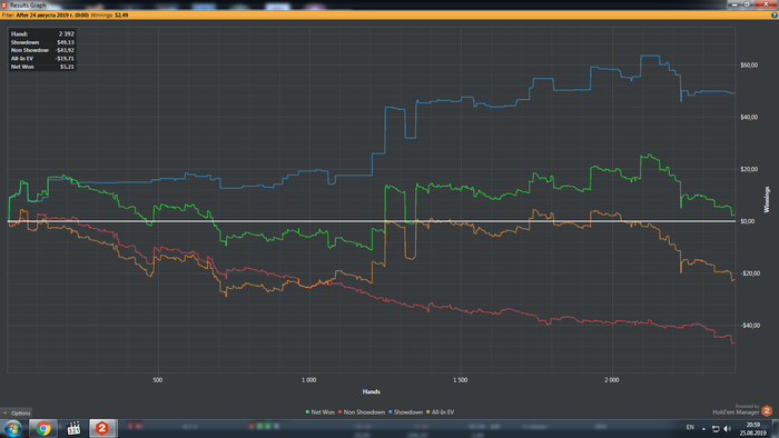 Пришло время подвести итоги августа. Сыграно 50к раздач с чистым профитом 48$ , по турнирам заносов не было ( играл только сателиты дешевые практически ), кэшбек процентов 5% получил. Больше расстраивает свой настрой на игру, постоянный поток информации с ютуб , трачу много времени что бы разобраться в смыслах прошлого, вместо того что бы принять и двигаться дальше. Самый непродуктивный месяц лета, месяц отпусков и отдыха, экгрегором которого отчасти проникся) Из хорошего могу выделить отчеты на джипси , работа над игрой стала ежедневной необходимостью, нашел товарищей на стриме и форуме, стал работать в скайпе с регулярами своих лимитов , задался целями.