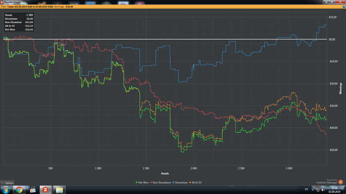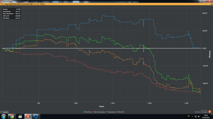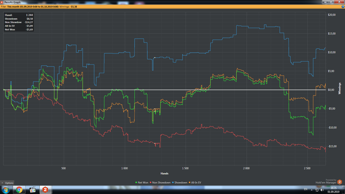 Тяжело настроить себя катать в выходные дни, буду ставить эту задачу в будни, готовиться так сказать. Второй день чувствую печаль от ухода лета, это уныние не от упущенных возможностей или ностальгия по куражу, а скорей по необъяснимой связи между слоем этого мира и тобой. Первое лето, где я в полном одиночестве часами гулял по лесополосе, идя по зову внутри, ощущая палитру запахов от деревьев и цветов, перед глазами появлялись слайды, которые никогда не видел, открывались новые истины в мироощущении. Теперь с каждым днем будет холоднее , запахов меньше , общее настроение вокруг депрессивнее, а когда выпадет снег, вообще кажется место для радости внутри не будет. Мои планы на это лето даже близко не осуществились, строились они на цикличности процессов и принесли много душевной боли, которая послужила катализатором для чего то большего, а именно ощущение связи с окружающим меня миром, природой, с тем пространством, в котором огромное количество энергии, информации, любви. В 2020 моим планам на весну - лето ничего угрожать не будет, они довольно просты и скромны - это возможность больше проводить времени на природе и хорошая погода. Буду безумно рад, если жизнь предоставит мне возможность зимой посетить жаркую страну, с ее уникальной природой. Очень бы хотел посетить Вьетнам или остров Бали. С сентября более ответственно подойду к покеру, с постановкой целей. График за 2 дня: