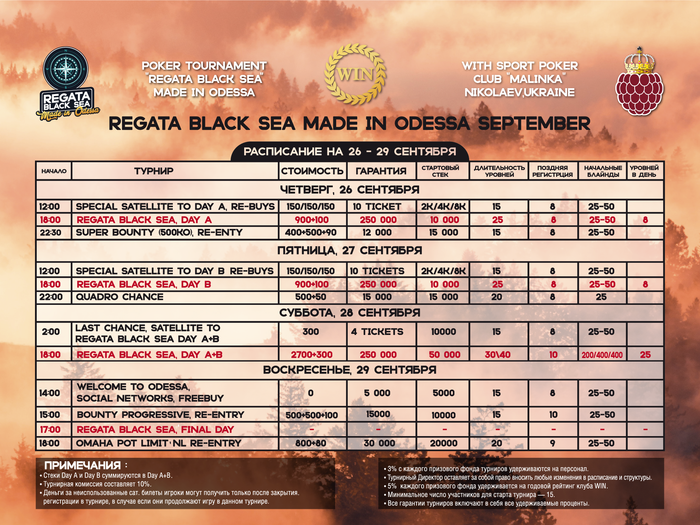 Пока остался запал и желание стать первым 😀 «WIN» анонсирует расписание на новую серию турниров «Regata Black Sea», которую мы проводим совместно с нашим партнером — клубом спортивного покера «MALINKA» 🏆 Готовиться к турнирам уже можно 😉 И рассказать друзьям тоже, чтобы в этот раз они точно ничего не пропустили 👌 ____________ Welcome! Одесса, Дерибасовская 15 Info & Reserve: +38 (093) 112 02 96