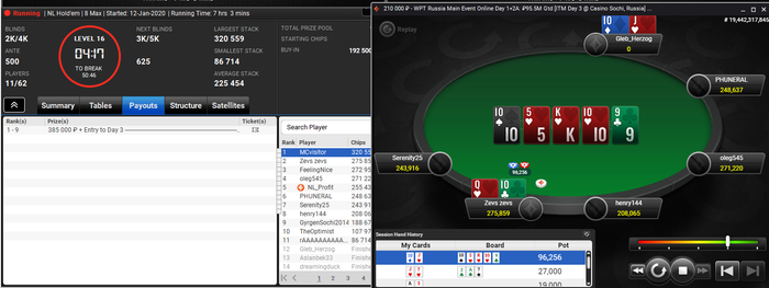 Сателлиты - в целом вполне проходимы. Соблюдая дисциплину, не стремясь выиграть каждый банк, ища слабости оппонентов - это все поможет благополучно пробраться в главное событие. Для меня такой опыт был первым, и удачным с первого выстрела - то есть чтоб стало понятней, чтобы принять участие в онлайн дне WPT MainEvent, мне понадобилось лишь 680 рублей и 7 часов 14 минут.