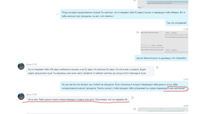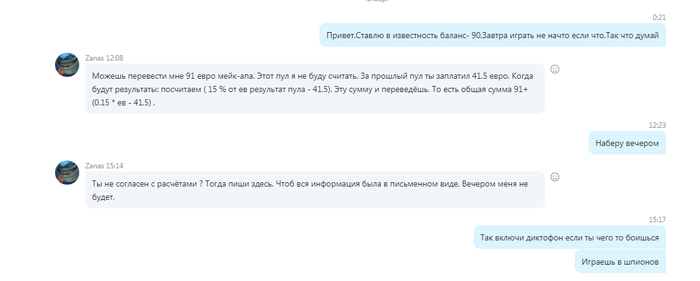 В скайпе мы договорились о новом договоре только по бекингу, но без обучения. Мейкап перевели в этот договор. Так как игрок вступил в пул, условия договора были простые 15 % от ев пула за бекинг. Схема была такая же, если он проигрывал мой транш, он депозитил свои деньги, отыгрывал, забирал то, что внёс и оставлял сумму моего первого транша в 91 евро, который я перевёл 4 месяца назад. Еще во время первого договора по обучению и бекингу я заметил не совсем адекватное поведение игрока. Он мог начать предъявлять претензии на ровном месте, постоянно жаловался, мне нужно было напоминать о переводах ему. Я очень много посвятил время обучаю его во время первого договора. Очень устал от него. Во время второго договора я надеялся отдохнуть, так как здесь был только бекинг и обучение здесь не было. Но и здесь он не давал покоя, предъявлял какие то претензии, все время спрашивал вещи, которые можно узнать самому. Другими словами отнимал время и энергию. Апогеем его претензий стали то, что я якобы его перестал обучать и не уделяю ему времени. Договор по обучению был давно закончен (06 16 ) и у нас был договор по бекингу. Тогда он начал возмущаться , что это за договор по бекингу, при котором он играет за свои ? Хотя почти 5 месяцев назад сам решил играть на свои (во избежание конверсии валют) и ни разу не попросил транш. Устав от всего этого я предложил разорвать договор, чтоб он нашёл другого бекера. Он с трудом, но согласился. Пул уже был закончен. Нужно было дождаться результов пула, чтобы знать точные расчёты. Пришли результаты пула и тогда он придумал термин "Мейкап бекеру". Этот термин и раньше проскальзовал в его речи, но я не очень обращал внимания так как не понимал о чём он.