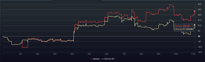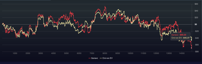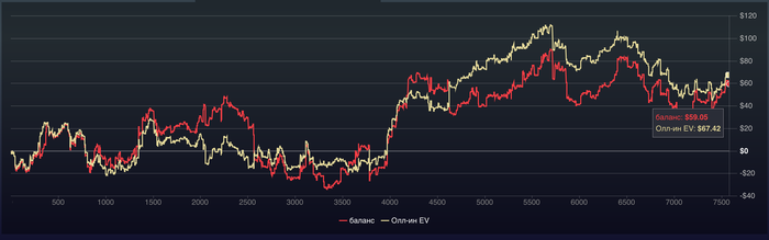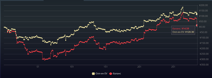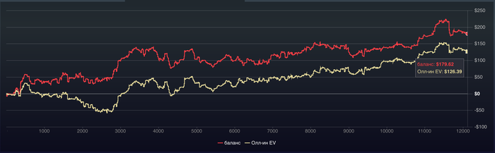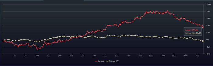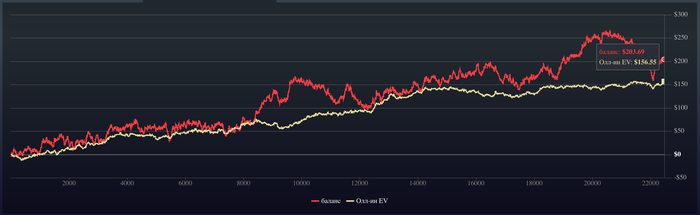 Теперь посмотрим что по графику , график красивый , идет вверх , баланс даже больше чем EV, то есть на 50$ повезло больше выиграть. По графику +203,69$, но с учетом рейка -243,89$.