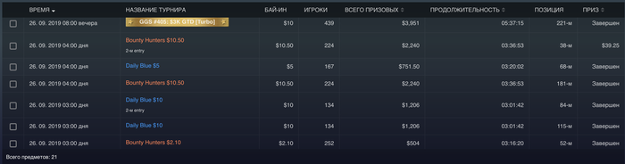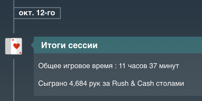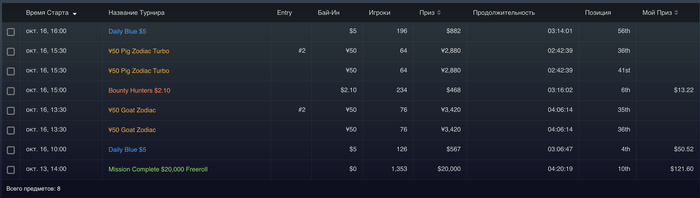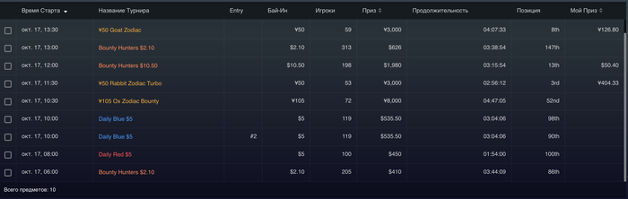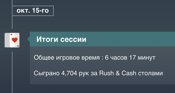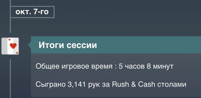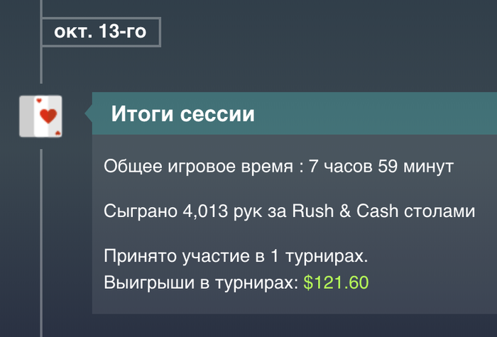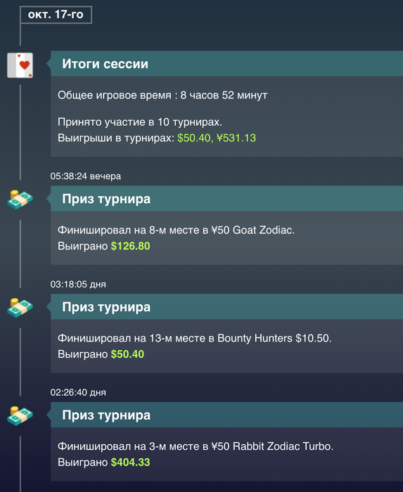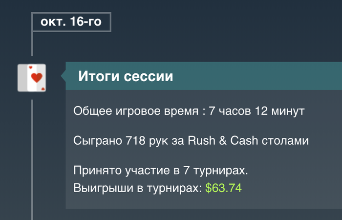 День 53 Турниры порадовали , продавал доли , поэтому удалось поиграть турниры не по бр , и далеко пройти. Там где турниры не за доллары , показывает что выиграл доллары , но на самом деле нужно делить на 7, чтоб получить в долларах МТТ +50,76$ Касса на данный момент Итого выводил 300$( в день 9-10 80$, в день 24-25 120$, в день 35 100$ ) Proffit Rush&Cash: today 0$ // all -655,25$ количество раздач 0 // итого 56 265/100 000 Proffit MTT : today +50,76$ // all +213,7$ Proffit AoF Holdem: today 0$ // all -250,68$ количество раздач 0 // итого 25 902/100 000 Proffit AoF Omaha: today 0$ // all -87,97$ количество раздач 0 // итого 1 623/10 000 Rakeback : today 0$ // all +182,57$ Jackpot Holdem: +175,03$ Jackpot Omaha: +439,78$ Рейк гонка: +240$ +100$