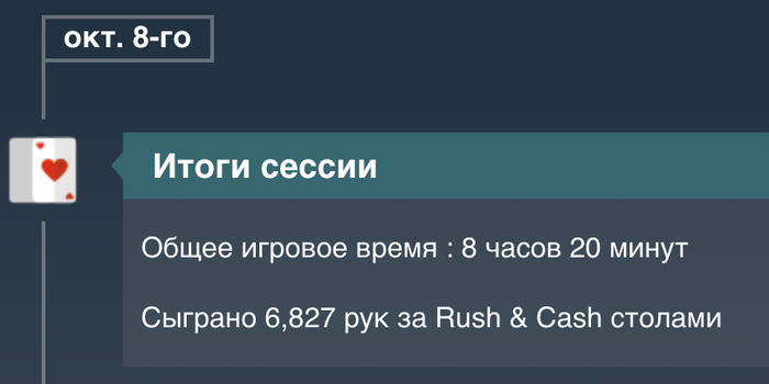 День 49-52 Сложно для меня Rush&Cash, минусую тильтую , эту неделю пропущу , соберу все силы , для последней недели. В воскресенье играл фрирол с призовым фондом 20к$, билет который нужно заработать выполняя ежедневные миссии на PokerOK, и понял я как я соскучился за МТТ, удалось даже дойти далеко пройти , но в конце не сложилось , когда оставалось 15 человек, 2 раза проиграл с , а в последней раздаче с , не повезло выиграть монетку против и занял 10 место, а за первое место было 2700$ MTT+131,24$ Rush&Cash 11735 раздач, по графику -101,72$, а с учетом рейка -221,27$. Рейкбек+15$ Касса на данный момент Итого выводил 300$( в день 9-10 80$, в день 24-25 120$, в день 35 100$ ) Proffit Rush&Cash: today -221,27$ // all -655,25$ количество раздач 11735 // итого 56 265/100 000 Proffit MTT : today +131,24$ // all +162,94$ Proffit AoF Holdem: today 0$ // all -250,68$ количество раздач 0 // итого 25 902/100 000 Proffit AoF Omaha: today 0$ // all -87,97$ количество раздач 0 // итого 1 623/10 000 Rakeback : today +15$ // all +182,57$ Jackpot Holdem: +175,03$ Jackpot Omaha: +439,78$ Рейк гонка: +240$ +100$