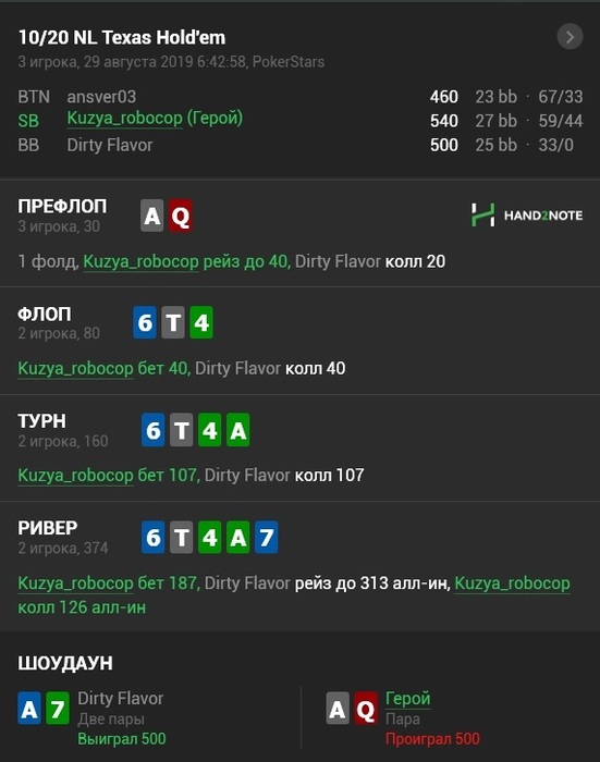 в глубоких стэках в сухие доски ставлю до половины банка включительно после рейза флопа (простая схема рейз-сибет). Ставка меньше будет выглядеть как слабость и даст повод оппоненту меня перекрутить либо выгодно коллировать с любым мусором и кучей возможностей поймать свои ауты на терне и ривере. В этой раздаче еще на редкость попался товарищ, кольнул пол банка с воздухом хуже моего. Ну а дальше ГСЧ был с ним заодно))))))