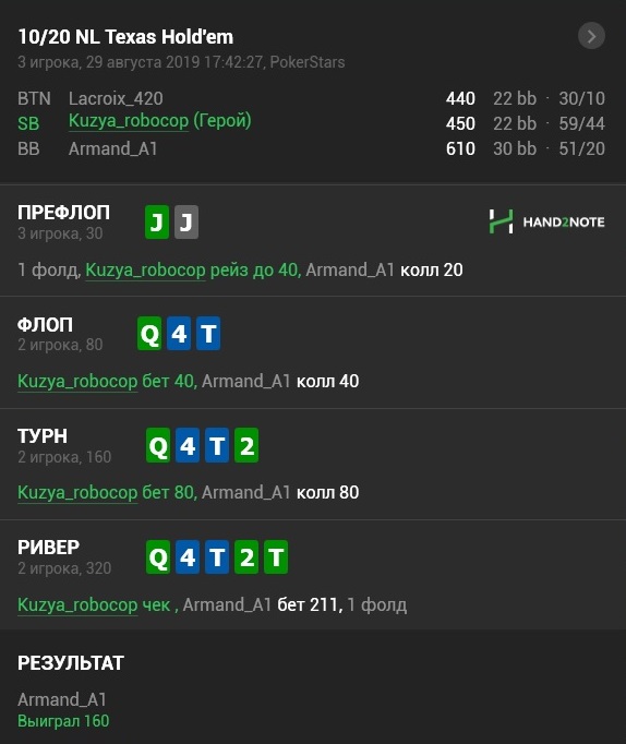 Eagle8914, про вторые и третьи пары с тобой согласен, поторопился. А по поводу валетов. На что у тебя шансы? У тебя готовая рука, надо чтобы ему было не по шансам колить. Я бы бет/пас сыграл, только поставил больше. Если что я фиш)