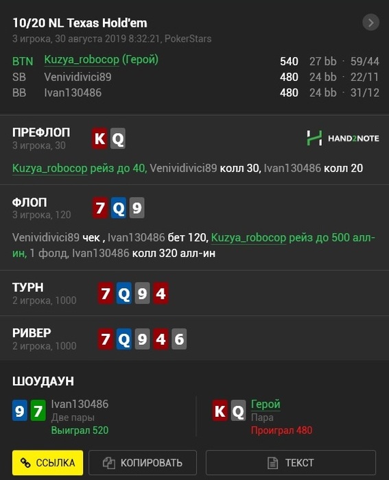 Ну а тут ситуация противоположная, когда скинул руку, а потом думаю, правильно ли это было. При разборе прикидывал, что с учетом колла оппонентом ставок флопа и терна он мог тащить СД, ФД, даму, либо десятку. В итоге не доехало только СД, против остального я позади. Вопрос был ли кол ривера?