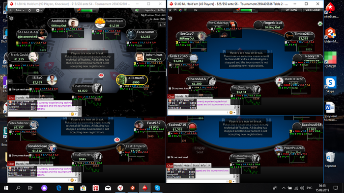 TinaDmitrieva, как то раз такое было, все столы зависли у всех, потом игра возобновились, лишь блайнды выросли, согласно пройденному времени. Читал уже пошла игра. Как успехи?)