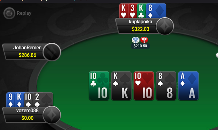 Депнул на пати все таки.Планирую откатать по банкролу около 30к рук на 10м лимите пло, соответственно если не зальюсь раньше,так же подключаю турниры по 3-5-11 баксов. Первая сессия крайне хуевая. В нескольких важных спотах в турнире где шел с хорошим стеком выше среднего, пару раз не повезло во флипах -где стоял выше QQ-AQ (ривер А) ,потом была совершенно пидорская раздача, у меня AQ делаю пфр против сб и бб, сб подколил,флоп Q83,я делаю конский цбет,оп колирует,терн 3(отличный терн подумал я) задвигаю алын. Оп колирует и у него А3 сукааааа