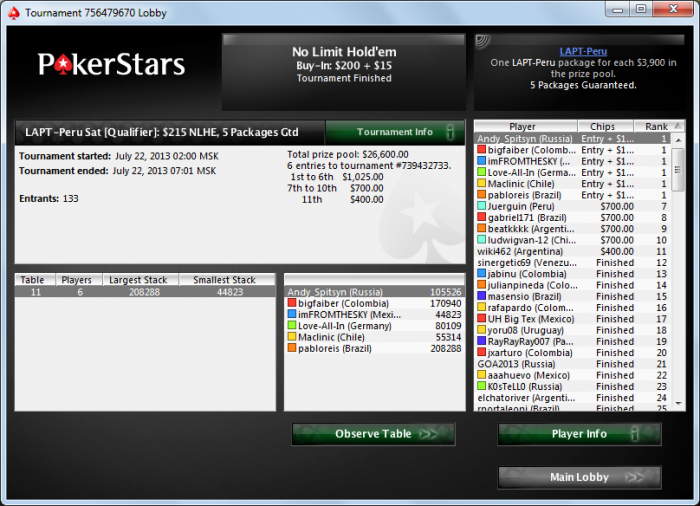 Перешел в день 3 мейна ЛАПТа Перу, стэк больше среднего. Осталось 28 человек. Завтра продолжим (т.е. по мск времени уже сегодня). Трансляции на http://www.lapt.com/news/ и на http://www.codigopoker.com/ (на испанском). Стрим с тв-стола на tvpokerpro.com в 21-00 по мск. gl