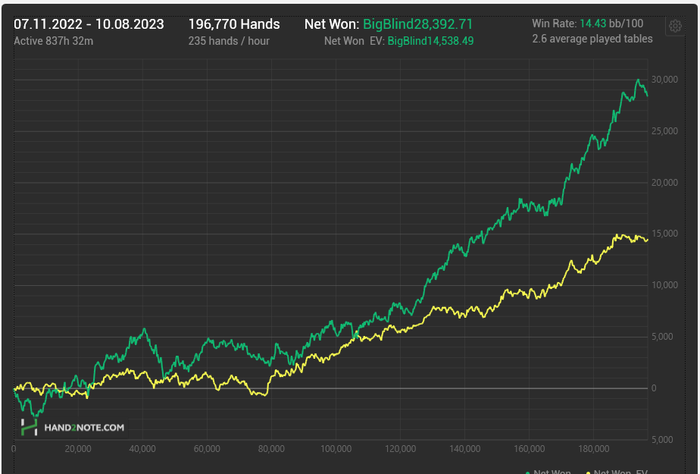 Подписав контракт, я был асболютно шокирован, увидев никнеймы игроков. Топовые реги 100-1к того времени на ПС были частью этой конюшни. Получил доступ к материалам, ушло около недели на просмотр всей библиотеки. Получив первый транш, заряженный на успех и унижение оппонентов, отправился на покорение нл25. И вот оно, чудо, смесь из полученных знаний вкупе с апстриком и лимит нл25 который до этого никак не давался был повержен за 2 недели. Показав достойный винрейт и относительно неплохое качество игры, получил зеленый свет на подъем на нл50. Паралельно с этим, один хороший человек предложил мне поиграть в приложении. Как оказалось игра была ОЧЕНЬ легкой и подъем до максимального лимита в клубе (на тот момент это нл80) прошел за месяц с небольшим.