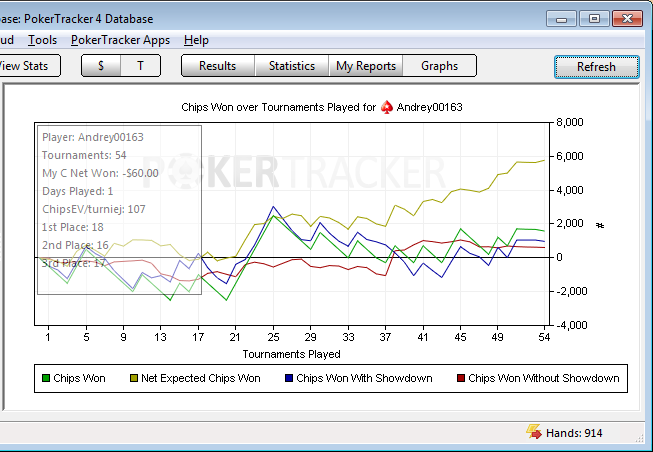 По результатам месяца - челендж провален. Это хороший повод для попытки номер два, учтем все ошибки и будем двигаться в Июле. Ниже график за июнь: Теперь скидывать отчет буду каждую неделю по вторникам. Цели ставлю на неделю, а не на один день т.к. на дистанции 200-300 турниров все равно ничего не увидишь, в прошлом месяце такие вот проверки графика только в тильт вгоняли, хотя общая картина не такая уж плохая была. За первую неделю месяца главная задача - войти в режим и нарастить темп. Поскольку играть буду в основном в рыбные дни - цель до вторника EV chips: 70+ / кол-во турниров: 650+ (чт-50 / пт-100 / сб-150 / вс-200 / пн 150+).