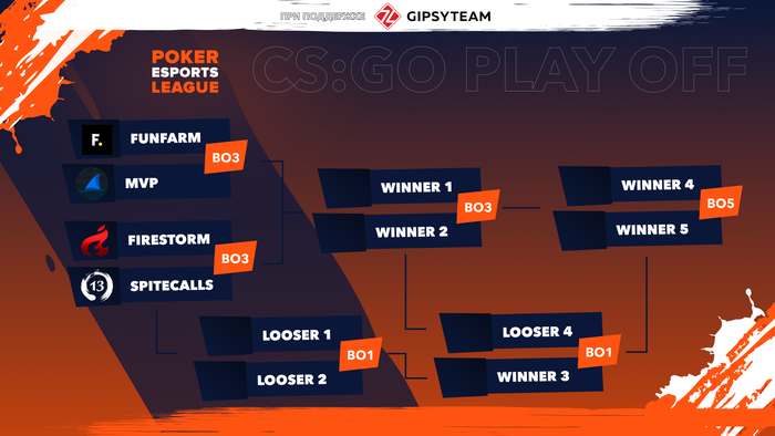 Сегодня будут свистеть пули и рваться гранаты - мы начинаем стадию плей офф ESPORTS POKER LEAGUE по CS:GO! Игровой день начнется в 16.00 МСК матчем между командами FUNFARM и MVP, занявшими первое и четвертое место в групповой стадии, и продолжится зарубой между FIRESTORM и SPITECALLS, занявшими соответственно второе и третье место в группе. Очень ждем всех желающим понаблюдать за этими битвами на наших каналах тут или тут. До встречи! А сама сетка PLAYOFF выглядит следуюшим образом