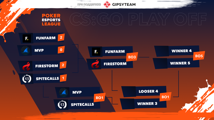 А мы продолжаем следить за развитием событий в ESPORTS POKER LEAGUE по CS:GO! В этот четверг начался Play Off, давайте вспомним, как это было! Групповая стадия нашего драйвового турнира подошла к концу, и в плей-офф вышли команды FunFarm в роли абсолютного и пока непобеждённого ни на одной карте чемпиона, TeamFirestorm в роли второго фаворита, ребята не смогли выгрызть победу только у FunFarm в финале групповой стадии, Spitecalls которые отлично показали себя в течение всей групповой и идущие вровень в общем зачёте с ними MVP. Play-off был выбран в формате BO3 чтоб уж наверняка определить лучших, и первыми в схватке сошлись игроки команд FunFarm и MVP, и результатом стал разгромный счёт 16:3 в пользу FunFarm. Это не стало откровением, особенно после последних игр, где FunFarm показывали уровень игры, достойный профессиональный сцены. MVP сражались, или очень пытались сражаться, и до конца не опускали руки, но всё же им немного не хватило, FunFarm и правда крайне сильны.