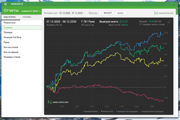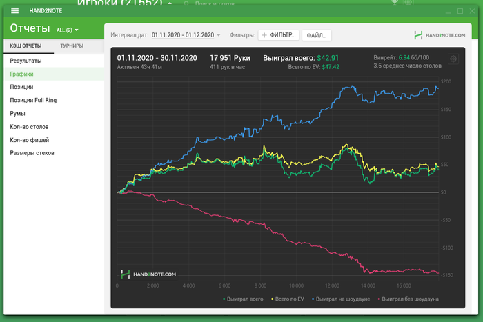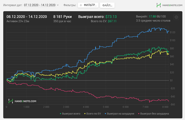 Результаты конечно отличные, и в плане винрейтов и в плане стабильности и в плане дистанции. За последний месяц нереально прибавил в понимании игры против фишей, мне кажется это был основной пробел в моей игре, который не давал показывать винрейт выше 10бб/100. По словам тренера я должен уходить как минимум до нл50 и это явно не предел, хотелось бы в это верить.