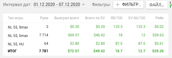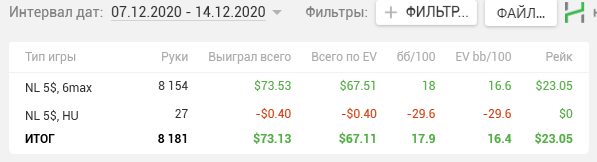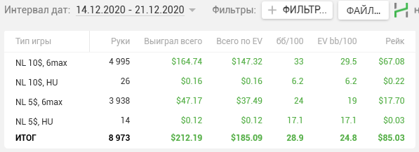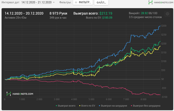 Катка идет +- по плану. Играть стараюсь каждый день, выходной могу взять по состоянию, если сильно понадобиться, но пока чувствую себя хорошо. Вставать рано сейчас легко из за того что ложусь в районе 23-00. Банкролл уже +- неплохой для НЛ10, но подключать десятку не спешу, хочу иметь минимум 30БИ рабочего лимита, возможно на следующей неделе удастся достичь этой цели. Пока не делал кешаутов и это важно, но возможно в ближайшее время придется потратиться на учебу, надеюсь уйдет на это не больше 50$.