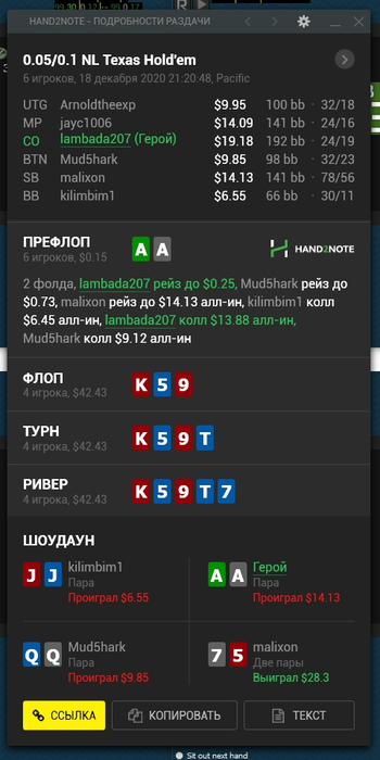 dibidibidis @ 21.12.2020 lambada208, привет, кэш играю недавно и пока только 9макс. Есть какие-то преимущества играть 6макс вместо 9макс кроме того, что мы в целом играем быстрее/динамичнее, больше дистанции накатываем и прочее? Я просто думаю, если я сейчас все равно в самом низком лимите, есть ли смысл прямо сейчас переходить на короткие столы и лучше осваиваться именно там, если например там больше выгоды можно извлечь, или продолжать откатывать столы 9макс.