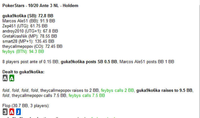 В следующей же раздачи мне раздали И этот оппонент был наказан моим чеком на тёрне ! Не всегда выставление на префлопе правильное решение, не стоит рисковать , видя топ пару, я бы не выкинула
