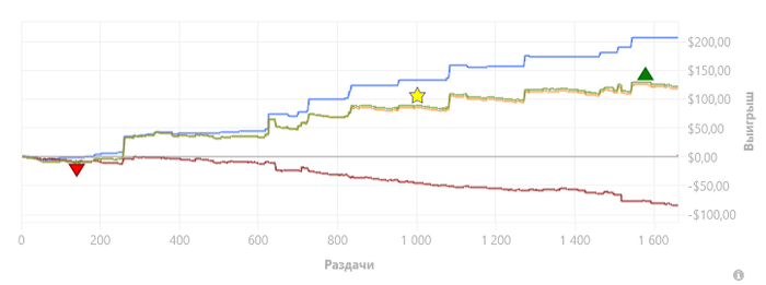 Идет очень тяжело. Примерно 4К рук в ноль. Где-то косячу, где-то очень обидно доезжает причем именно фишам 85/5 и именно ривером.